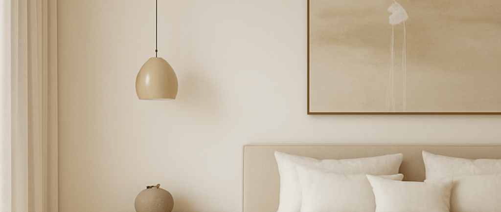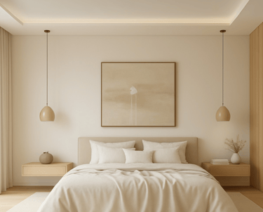 A iluminação foi concebida como uma camada fundamental de aconchego. O forro recebeu um rasgo linear de luz indireta em tonalidade quente, capaz de transformar o ambiente sem recorrer a gestos cenográficos. Essa luz difusa cria a sensação de acolhimento e destaca a textura dos materiais, sem ofuscar ou competir com outros elementos. Para complementar, adotei pendentes laterais em acabamento fosco, que oferecem iluminação de apoio pontual e reforçam a simetria ao redor do leito. A escolha do metal acetinado evita reflexos agressivos e traduz sofisticação discreta, em sintonia com o conceito japandi.